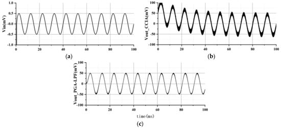A differential signal with a frequency of 100 Hz and an amplitude of 1 mVpp is input to simulate the EEG signal, and the PGA–LPF gain is set to 1 x for transient simulation. The simulation results are shown in Figure 19. It can be seen that CCIA achieves 40 dB amplification of the signal. The PGA-LPF filters the signal to filter out the high-frequency ripples and realize normal amplification of differential signals, which is consistent with the expectation. A comparison of theperformance with other related works is shown in Table 2. Compared with other reporteddesigns, the design presented in this work achieves good noise and CMRR when implemented in the UMC 40 nm CMOS process.