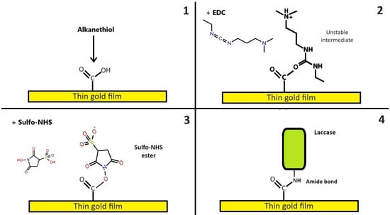 Immobilization process of laccases on the thin chromium–gold film chip. In the step 1, alkanethiols are added to the thin gold surface. In step 2, the EDC is added, forming an unstable intermediate. In step 3, the NHS is added, creating a sulfo-NHS ester. In step 4, NHS is replaced by the laccase through an amide bond.