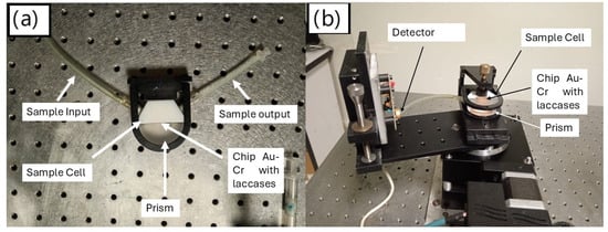 Assembly of the prism and the chip on the SPR equipment: (a) assembly of the prism, the chip with a thin gold film with the immobilized laccases, the prism and other components. (b) Set up of the prism, sample cell, chip with immobilized laccases and the other on the SPR equipment.