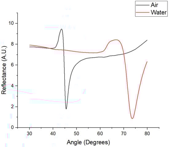 As previously mentioned, the chip coated with a thin gold and chromium–gold film was functionalized with alkanethiols before immobilization. This prepared chip was installed in the SPR equipment, and reflectance spectra were obtained through an angular sweep ranging from 30 to 80°. This sweep was conducted in both air and water environments. Figure 5 illustrates the shift in the resonance angle, which was attributed to a change in the refractive index during the angular sweep with air and water. The fixed working angle was selected at the middle of the slope of the resonance angle observed in water (71.5°), as this angle provided the highest sensitivity. Both the immobilization and calibration curves were conducted at this fixed angle. The estimated film thickness was determined to be 50 nm for gold and 3 nm for chromium, with the methodology for estimating the film thickness detailed in Section 2.1.