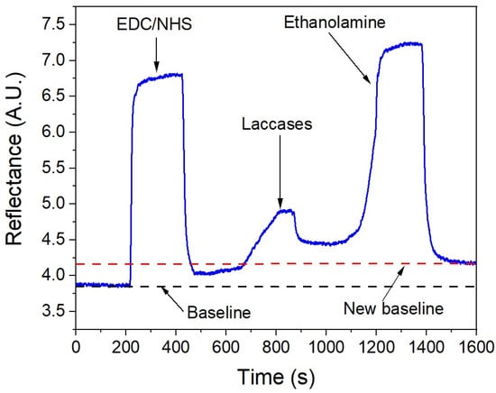 Following the functionalization with alkanethiols, the laccases were immobilized using a combination of 1-ethyl-3-(3-dimethylaminopropyl) carbodiimide hydrochloride and n-hydroxysuccinimide (EDC/NHS). Figure 6 illustrates the real-time immobilization process. After adding each reagent, an increase in the reflectance can be observed, which subsequently decreases during the washing phase. Eventually, the signal stabilizes—evident as a flat zone—once all non-bound molecules have been removed, leaving only the remaining molecules attached to the surfaces and resulting in a new higher baseline.