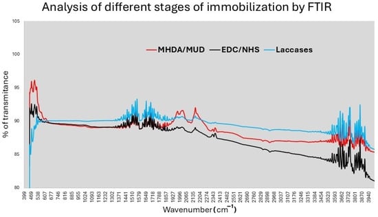 The immobilization process was also analyzed using FTIR (refer to Figure 7). The FTIR spectra reveal two small signals corresponding to CH2 stretching of the alkanethiols MHDA/MUD in the range of 2860–2927 cm−1, as well as C=O stretching and COO- stretching signals between 1500–1700 cm−1 [,]. These peaks are present at all stages, indicating that the alkanethiols are bonded to the Au–Cr surface. Additionally, around 1820 cm−1, a change in the percentage of transmittance is observed upon the addition of EDC/NHS, attributable to the symmetric stretch of C=O []. Lastly, a variation in transmittance is noted in the region of 400–500 cm−1, corresponding to the bands associated with laccases [].