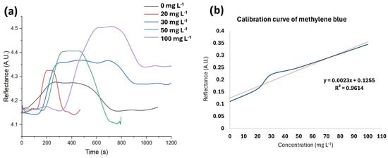 After selecting a fixed angle of 71.5°, stocks with varying concentrations of methylene blue were analyzed using SPR, creating a calibration curve. The calibration curve and the corresponding equation of the straight line are presented in Figure 8. As illustrated in the figure, there is an observable increase in reflectance with rising concentrations, which can be attributed to the interaction between the laccases and the analyte. Subsequently, a plateau is reached when maximum reflectance is attained and the signal stabilizes. Following this, the signal decreased as the biosensor was rinsed with 40 nM NaOH and water, separating the analyte from the bioreceptor. From the graph, we estimate response times of 252, 126, 135, 81, and 180 s for concentrations of 100, 50, 30, 20, and 0 mg L−1, respectively.