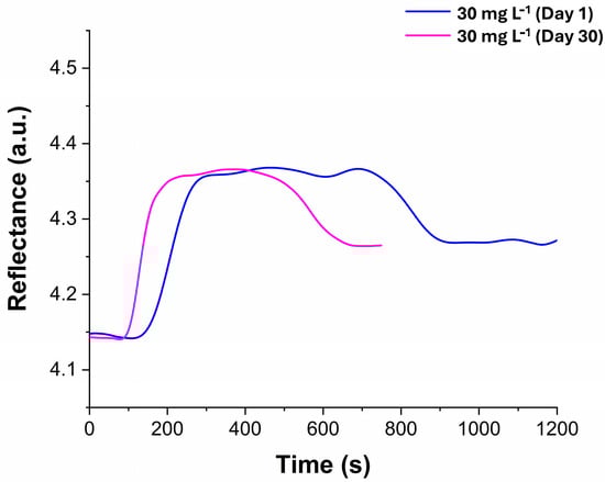 The stability of the sensor was evaluated by analyzing samples (n = 2) of methylene blue at a concentration of 30 mg L−1 at room temperature, both on the day the laccases were immobilized (day 1) and again on day 30 after immobilization. The comparison of intensity reflectance (measured in arbitrary units, A.U.) is presented in Figure 9. A variation coefficient of 3.61% was obtained, and a T-test statistical evaluation revealed no significant differences. This data confirm that the sensor’s signal remained stable over time. Additionally, the sensor was used for 17 cycles and stored in a 50 mM MES buffer at pH 5.0 at room temperature when not in use. In this study, the sensor demonstrated greater stability than in other research. For instance, Tavares et al. immobilized laccases on multi-walled carbon nanotubes through adsorption and maintained catalytic performance for up to nine cycles []. The differences in stability may be attributed to various experimental conditions, such as the immobilization method, the support material, and the source of laccases. In our study, the laccases came from the Japanese lacquer tree (Rhus vernicifera), whereas Tavares et al. used laccases from the fungus Aspergillus orizae. Furthermore, Tavares et al. assessed stability at a higher temperature (40 °C), which may negatively impact enzyme stability. Additionally, in immobilization by adsorption, the process can be limited by reduced flexibility in operational conditions, such as changes in pH, ionic strength, and potential abrasion on the enzyme surface due to mixing []. In another study, Othman et al. immobilized fungal laccases from Myceliophthora thermophila using one-point and multi-point covalent attachments on native and modified new commercial epoxy carriers. They evaluated the stability at pH 3.0 and a temperature of 70 °C, achieving 95% stability for 10 cycles []. Again, the variations in experimental conditions and temperature could affect the sensor’s stability.