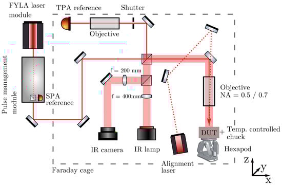 The measurements were performed at CERN-SSD table-top TPA-TCT setup. A detailed description of the setup can be found in [,], while within this work only a brief overview of the setup is given. Figure 1 shows the setup’s schematic layout. A fibre laser that provides a central wavelength of , a temporal pulse width of , and a maximum pulse energy of is used. For the measurements, the laser repetition rate is set to and the laser energy is adjusted, using a Neutral Density Filter (NDF), to generate a charge of in silicon, if not mentioned otherwise. The laser beam can be described by a Gaussian beam with the beam waist and the Rayleigh length . All measurements are performed at 20 °C, while the DUT’s ambient is flushed with dry air to establish a relative humidity of about 0%. The data acquisition is performed by an Agilent DSO9254 oscilloscope, which has a high bandwidth limit at 2.5 GHz and a sampling rate of . The average current transient of 256 single acquisitions is recorded. A CIVIDEC C2HV transimpedance amplifier is used, which has a bandwidth from to and provides an amplification by a fcator of () [].