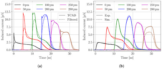 Figure 2a shows simulated current transients of different focal depth as obtained from the TCAD simulations (TCAD) and after a subsequent mathematical filtering process (Filtered) described in Section 3. The latter simulation step is taking into account effects from the sensor capacitance and the electronic readout. For a better visibility of the current transients, the starting time is increased by for each depth and the depth is given with respect to the DUT’s top side. It can be seen that the electronic readout affects the rising edge of the simulated current transients, by rounding out the starting peak. This is especially notable for current transients obtained close to the top side, because the electrons are collected at the top side and quickly collected, which results in a fast signal that is especially affected by the shaping. However, the amount of collected charge (CC) is not affected by the electronic readout. An agreement within 0.1% between both current transients is found. A comparison between the filteredcurrent transients and the experimentally measured current transients of different depths is presented in Figure 2b. The simulated current transients are in good agreement with the measured ones. For the experimental current transient recorded at a much higher amplitude is found compared to the simulation. This is an effect of laser reflection at the back side silicon-air interface that leads to an increase of the laser intensity, i.e., excess charge carrier density, which is not considered in the simulation. The simulated current transients close to the top side have an about longer collection time, while the agreement is better for current transients simulated closer to the back side. Current transients from the top side of the DUT are dominated by the drift of holes. Holes have an about three times smaller mobility than electrons, which make them more sensitive to uncertainties in the device and operational parameters, like the active thickness, temperature or the charge carrier drift model. The origin of the slight disagreement might be multifold and was not further investigated. For the following sections, the filtered simulated current transients are used for the comparison to the experimental data.