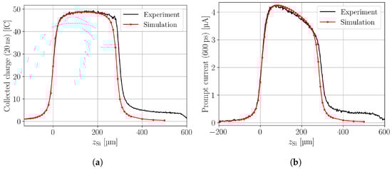 Simulated and measured charge collection within (a) and prompt current at (b) along the device depth.