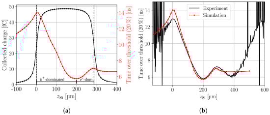 (a) Simulated collected charge profile overlapped with the simulated time over threshold profile along the device depth. The regions where holes or electrons dominate the collection time in the current transients are indicated. (b) Comparison between the simulated and measured time over threshold profile along the device depth. The experimental time over threshold profile is affected by reflection, which mirrors the region at the back side to .