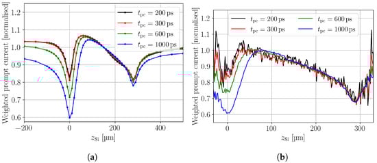 The weighted prompt current (WPC) method was introduced in order to correct for a position dependent charge carrier generation []. Similar to the prompt current, it is an approximation to the drift velocity and weighting is obtained by dividing the prompt current by the CC. Figure 5 shows the simulated (a) and measured (b) WPC for different prompt current times along the DUT depth. The absolute values of the simulated and measured WPC profiles are in good agreement, as the absolute values of the prompt current and CC are in good agreement. Absolute values for the WPC profiles are not presented here, because all WPC profiles are normalised to the value at , to ease the comparability between the different values. The simulated and measured WPC profiles show the same features. Valleys are found at the top and back side and the depth of the valleys at the top side increase with increasing . The valleys are caused by charge collection within . The longer is selected the more excess charge carriers are collected and the less prompt current is extracted at , which leads to a decreasing WPC. Increasing bias voltages exacerbate this effect as the charge is than even faster collected. Hence, the should be selected as small as possible, while maintaining sufficient signal-to-noise ratio (SNR) and obeying the maximum possible probing band width. Band width limitations of the readout electronics are the reason why the valley depth is not significantly changing between and . The appearance of the valleys indicates that the WPC needs to be taken with care, when it is evaluated at the device’s boundaries. Further, the symmetry around the top and back side interface are caused by the shifting median of the excess charge distribution, as discussed for the ToT in Section 4.3.