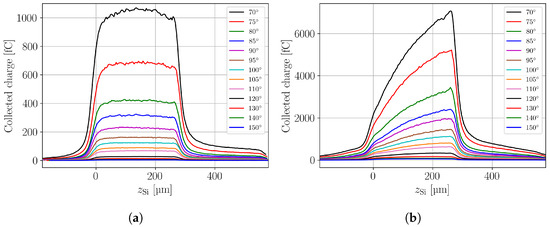 Experimental data: Charge collection within as function of the device depth for a PIN diode (a) and an LGAD (b). Both devices are fully depleted and operated at (PIN) and (LGAD), respectively. The charge collection profiles were obtained with different laser pulse intensities. The legend gives the angular setting of the NDF with the highest laser pulse intensity for the smallest angular setting.