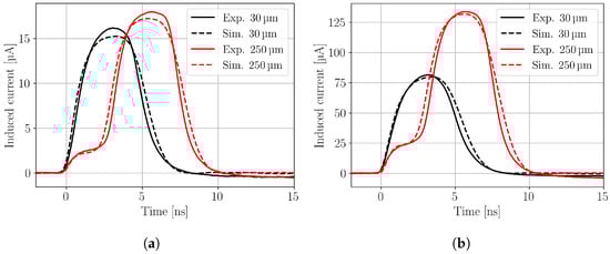 Figure 7 shows waveforms recorded with charge injection close to the top of the LGAD sensor at and close to the back of the sensor at for two different laser pulse intensities resulting in (a) and (b) of deposited charge in the sensor. It is clearly visible that for the ten times higher charge deposition, a more significant difference between the CC (i.e., integral of the waveform) at the front and at the back is observed. In addition to the experimental data, the simulated waveforms are shown. A good agreement is seen between simulation and experiment, taking into account that the simulated data is the unaltered simulation result, without any additional scaling factor.