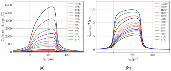 Integration of the simulated waveforms results in one value for the CC as function of focal depth and intensity of the laser pulse. The CC profiles for the various simulated laser intensities are given in Figure 8a. The shark-fin effect observed for the experimental data (Figure 6) is correctly reproduced in the TCAD simulations. Some deviations towards the backside of the LGAD are visible, but are known to be originating from the reflection of the laser beam at the back side metal of the device that was not taken into account in the simulation. The effect was already describe in Section 4.2 for the PIN detector data shown in Figure 3a.