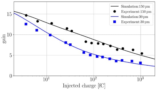 The gain values obtained at two different injection depths are given in Figure 9 for the experimental and the simulated data over three orders of magnitude in injected charge. The agreement between simulation and experiment clearly confirms that the shark-fin effect and the gain suppression mechanism in general, can successfully be simulated in TCAD simulations, employing a local impact-ionization model within the standard drift-diffusion simulation approach.