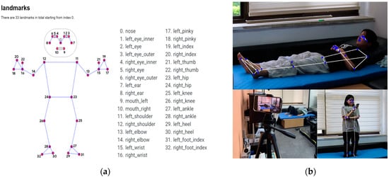 (a) MediaPipe skeletal framework []; (b) Experimental environment and key points by MediaPipe Pose.