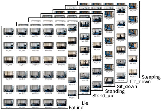 The experiment was conducted by seven participants (four males and three females), providing a diversity of fall patterns across genders. Participants were recorded performing different postures (refer to Table 1), with each posture captured at roughly 10 s intervals. For the safety of participants during falls, a mattress was laid on the floor, and the participants fell onto the mattress. By installing the mattress, participants could perform posture more realistically while minimizing injury risk.