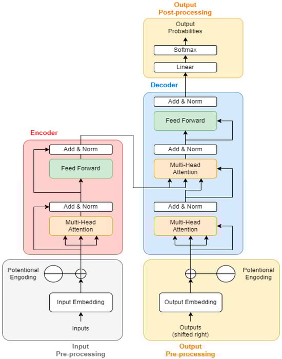 When analyzing pose data, the attention mechanism allows the model to focus on specific key points that are more relevant at different stages of an activity. For example, in swimming, the model might focus more on the arms’ position during the initial stages and more on the legs during the latter stages. The attention mechanism leads to better performance in tasks like sequence-to-sequence prediction, translation, or time-series analysis, as it enables the model to handle long-range dependencies and capture nuanced relationships in the data []. It offers the better interpretability of the model behavior, as one can analyze which parts of the input sequence the model is focusing on at each step. Figure 3 describes the structure of the transformer model.