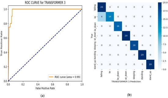 Transformer 2, which uses the Adam optimizer but with a higher dropout rate of 0.3 compared to Transformer 1, performs exceptionally well, with an accuracy of F1-score of 0.964 and a precision score of 0.962. These results are very close to those of Transformer 3, indicating that both configurations yielded strong performance in fall detection. However, Transformer 2 has a slightly lower accuracy compared to Transformer 3, which is the best-performing model according to Table 4. To further validate the prediction performance of the predictive model with the highest performance, a binary classification technique was used to measure classification performance through a fall-detection-class confusion matrix []. We also present an ROC (Receiver Operating Characteristic) curve [] in Figure 4 for the transformer.