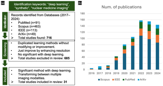 Particularly with clinical protocols, NMI provides functional and safe doses of radiotracers, enabling effective treatment planning by radiologists and clinicians. However, using radiotracers at low doses, which is crucial for minimizing the radiation exposure to patients, often results in noisy, low-quality images, which affect diagnostic accuracy. In most scenarios, it is challenging to accurately present the complete imaging processes associated with a patient’s condition [27,28], and digital records may be lost in clinicals studies [29]. To address these challenges, DL approaches in image synthesis can be employed during acquisition and reconstruction to enhance image quality by simulating the realistic structure and presenting the specific pathologies assessing diagnostic workflows [30,31]. Thus, image synthesis utilizing DL methods has improved the capabilities and expanded the therapeutic potential of nuclear medicine, thereby cementing its position in contemporary medical practice [32,33] and facilitating advancements in multi-modal registration applications [34]. This is reflected in the publication trends from 2017 to October 2024 for the keywords “deep learning”, “synthetic”, and “nuclear medicine imaging” on PubMed, Scopus, IEEE, and ArXiv (Figure 1b). The number of publications has been increasing by approximately 20 every year, indicating rapid advancements in nuclear medicine.