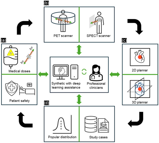 The operating protocols for NMI are specified in the guidelines and regulations established by professional societies [35] (Figure 2a). The advancement of PET and SPECT systems is crucial in NMI as these systems provide insights into the complex physiological and molecular activity of radiopharmaceutical tracers. These tracers emit gamma rays, enabling PET and SPECT to visualize molecular activities (Figure 2b). In SPECT, the gamma rays emitted by the tracers are captured by gamma cameras, which rotate to acquire multiple 2D images from different angles; these images are then reconstructed into 3D datasets. In comparison, PET detects gamma rays released due to positron annihilation, offering more detailed and precise 3D visualization of molecular activity (Figure 2c). Another consideration is that nuclear medicine depends on various patient-specific factors (age, sex, family-related, etc.), with per-case differences necessitating personalized treatment (Figure 2d). For example, Xia et al. [30] provided a proposed I2-GAN network to recovery missing cardiac MRI imputation by training it with 4848 subjects within a single cardiac phase from several population-based studies. Xia’s research presented the relation between population cardiac MRI slides and provided the missing data by using a synthesis image generation model with a high SSIM value (0.872) when evaluating 100 publicly available ACDC datasets, and also helped to segment the left/right myocardium ventricular region in the study case. Hence, integrating DL models into NMI is vital, as it helps to improve image quality and provides alternative solutions that replicate real scans, thereby assisting clinicians in analyzing complex medical data.