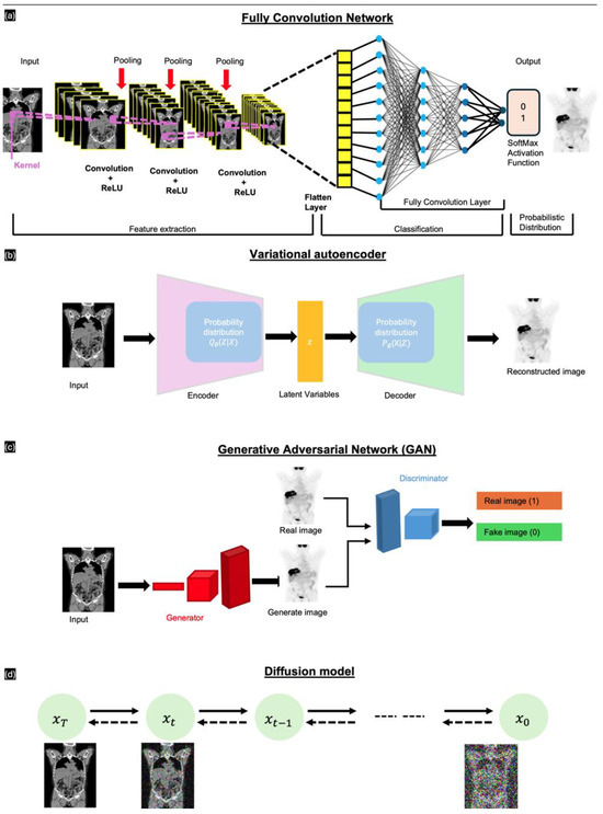 Long et al. [45] introduced fully convolutional networks (FCNs); these have been widely used in segmentation tasks, which involve classifying individual pixels into various categories. FCNs are crucial in NMI due to their ability to process medical images of any size, a feature absent in traditional CNNs. This advantage ensures accurate analysis and diagnosis without compromising patient information. As depicted in Figure 4a, an FCN comprises multiple layers arranged sequentially from input to output. These include the ReLU activation layer, followed by pooling layers that downsample the feature maps. After feature extraction, the network flattens the data and employs fully connected layers for classification. The final output uses a SoftMax activation function to generate a probabilistic distribution for classification. The network uses convolution filters or kernels to refine image data, ensure translation invariance, and preserve spatial information. The most common loss functions for FCN-based image-to-image translation include intensity-based pixel-wise loss functions, such as mean absolute error (MAE), which represents the pixel differences between the synthetic image and the ground-truth image.
