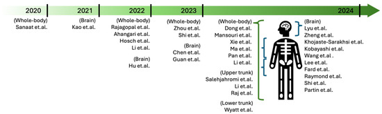In Figure 5, we preset a comprehensive overview of the 31 selected research articles mentioned in Figure 1a by timeline and their imaging area targets (brain, whole-body, upper trunk, or lower trunk). With detailed information, Table 1 lists studies in which MRI and CT images were used to synthesize nuclear medicine images, while Table 2 covers studies in which nuclear medicine images were used as the input. The observations in these tables focus only on aspects related to DL; experimental protocols or design parameters related to data acquisition are not included.