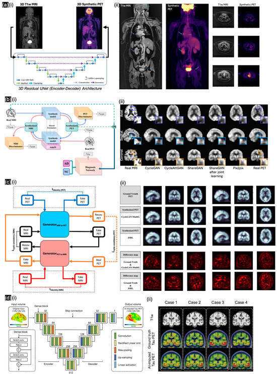 (a) (i) 3D residual U-Net architecture for generating synthetic PET images from MRI images, exhibiting significant stitching artifacts (blue arrows) in (ii) T1w-MRI between bed positions as well as loss in resolution in the head (green arrows); with different cross-sections denoted by blue arrows. Reproduced with permission from Rajagopal et al. [62]; published by IEEE Xplore, 2022. (b) (i) Overview of CycleGAN framework for MRI-to-PET translation, and (ii) visualization of ground-truth and synthetic PETs. Reproduced with permission from Khojaste-Sarakhsi et al. [68]; published by Image and Vision Computing—ScienceDirect, 2024. (c) (i) Novel joint learning framework combining unsupervised cross-modal synthesis and diagnosis for Alzheimer’s disease by mining underlying shared modality information to improve performance. Qualitative results of (ii) different cross-modal synthesis networks with SUV ratio error map between real PET image and synthesized PET image. Reproduced with permission from Wang et al. [72]; published by Medical Image Analysis—ScienceDirect, 2024. (d) (i) Dense U-Net architecture, and (ii) FDG-PET based tau-PET synthesis result. Reproduced with permission from Lee et al. [73]; published by Brain—Oxford Academic, 2024.