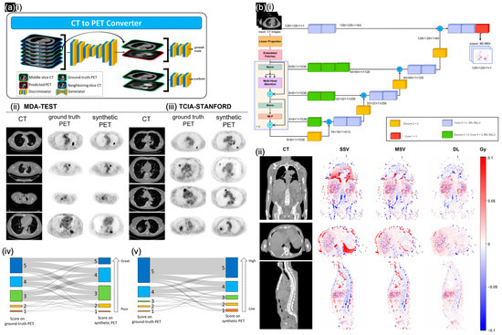 (a) (i) cGAN to synthesize PET images from CT scans. Validation of synthetic PET images based on (ii) MDA-TEST and (iii) TCIA-STANFORD testing cohorts; (iv) imaging quality difference; (v) tumor contrast difference. Reproduced with permission from Salehjahromi et al. [70]; published by Cell Reports Medicine—Elsevier, 2024. (b) (i) UNETR architecture to generate MS-based dose maps. (ii) Relative absolute error maps in cross-section views of SSV/MSV/DL methods. Reproduced with permission from Mansouri et al. [69]; published by EJNMMI—Springer Nature, 2024.