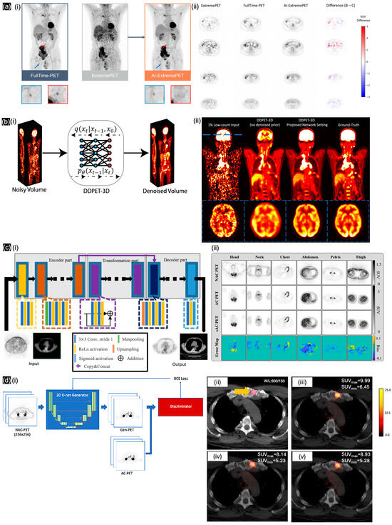 (a) (i) pix2pixHD to generate AI-ExtremePET from ExtremePET. (ii) Comparison between different cross-sections. Reproduced with permission from Hosch et al. [75]; published by EJNMMI—Springer, 2022. (b) (i) DDPET-3D model to generate synthetic full-dose PET volume from a low-count PET volume. (ii) Represents the whole-body/brain’s cross-section between synthetic and ground-truth PETs. Reproduced with permission from Xie et al. [76]; published by AxRiv, 2024. (c) (i) Modified pix2pix model and (ii) comparison of representative PET images in specific regions with error map. Reproduced with permission from Li et al. [77]; published by the European Journal of Radiology—ScienceDirect, 2022. (d) (i) Synthetic PET images produced by training a 2D pix2pix model, overlaid on CT and compared with (ii) original CT, (iii) original AC-PET on CT, (iv) V1-PET on CT, and (v) V2-PET on CT. Reproduced with permission from Ma et al. [78]; published by Oncotarget—Impact Journals, 2024.