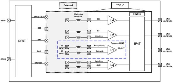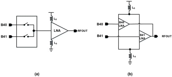 The ability to rapidly switch between gain modes while maintaining stability ensures that the LNA can adapt to varying signal conditions without introducing instability or excessive noise. Figure 1 illustrates a block diagram of a diverse RF front-end suitable for multi-mode cellular handsets, highlighting the role of external inductors for input matching and the use of SAW filters for band filtering in each frequency band. Generally, a Low Noise Amplifier is designed with a single input port and a single output port structure []. This single-port configuration is effective in minimizing circuit complexity and ensuring stable amplification performance by reducing noise. However, when configured in a Multiple-Input Multiple-Output (MIMO) system, the LNA circuit becomes significantly more complex [].