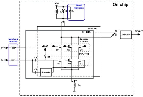 This direct addition of noise due to the switch’s insertion loss highlights the trade-offs involved in multi-band LNA designs. While a DPST switch design enables the LNA to operate across multiple frequency bands, the accompanying noise penalty must be carefully managed to maintain a low NF. This consideration is especially important in applications requiring high sensitivity and low noise, where even small increases in noise can significantly impact the overall performance. In this paper, we propose a novel reconfigurable input structure, as illustrated in Figure 3b. When a signal is input to either the B41 or B40 input port, the M4, M5, and M6 elements of the unused input LNA are turned off to ensure isolation performance between ports. Unlike conventional designs that rely heavily on switches for input selection and signal routing, the proposed architecture eliminates the need for switches by introducing reconfigurable cores that share the load and degeneration inductors. Isolation performance between the output and the unused input is crucial, and the proposed architecture ensures sufficient performance of over 30 dB. This innovative approach allows for the creation of independent LNA channels for each input stage, thus maintaining the integrity of the signal path while improving overall performance.