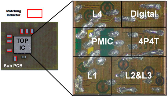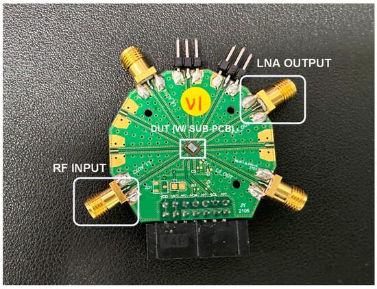 This involves precise control over the physical placement and routing of components on the Sub-PCB to mitigate unwanted parasitic elements that could introduce additional noise or loss into the system. Figure 4 shows the measurement board. The proposed LNA’s S-parameter performance was comprehensively verified using a Network Analyzer (E5071C, Keysight Technologies, Santa Clara, CA, USA) as the measurement equipment. Additionally, the operational speed in the time domain, among other aspects, was visually confirmed using an RF Signal Generator (E4438C, Agilent Technologies, Santa Clara, CA, USA) and Oscilloscope (DSOX3024T, Keysight Technologies, Santa Rosa, CA, USA). Figure 5 presents a die photo of the module containing the proposed LNA. As depicted in the block diagram in Figure 1, the die photo includes four LNAs labeled L1 through L4. The module’s output can be routed to the desired antenna through four outputs using a 4P4T switch. This paper specifically focuses on the L1 LNA. Additionally, the module integrates a PMIC and digital circuitry. The Sub-PCB is designed to accommodate the module IC and the matching inductors.