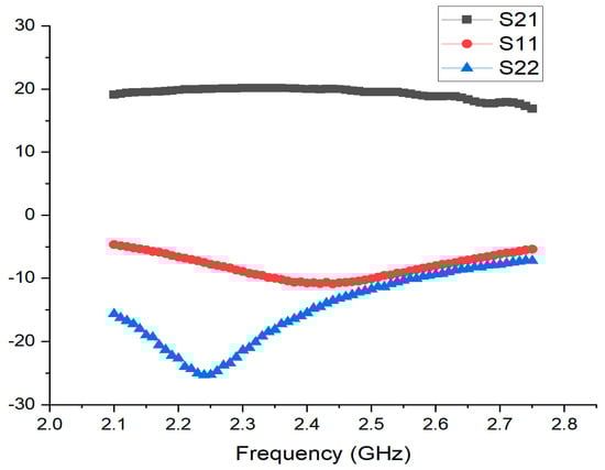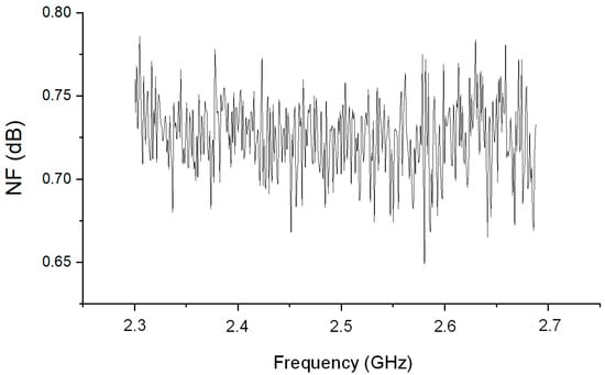 Figure 6 illustrates the input and output return loss values alongside the gain in Max Gain Mode. To evaluate the performance of the proposed LNA, measurements were taken across the target frequency range of 2.3 GHz to 2.7 GHz. The results demonstrate that the proposed LNA achieves a maximum gain of 20.4 dB in the Max Gain Mode. This high gain is consistently maintained across the entire frequency range, indicating robust performance even at higher frequencies. Notably, the return loss for both the input and output is observed to be consistently at least −8 dB throughout the frequency band. This suggests that the LNA provides excellent matching and signal transmission efficiency across the specified frequency range. These results highlight that the proposed LNA design is optimized to deliver high gain and superior return loss performance across a broad frequency range. This is a critical feature for RF communication systems, ensuring reliable performance and excellent signal quality in practical applications. Figure 7 presents the noise measurement results for the proposed LNA in Max Gain Mode. The noise performance is assessed across the frequency range of 2.3 GHz to 2.7 GHz, highlighting the efficiency of the LNA in maintaining low noise levels. The measurement results reveal that the LNA achieves a noise figure ranging from approximately 0.7 dB to 0.75 dB within the specified frequency band. This exceptional noise performance underscores the LNA’s capability to operate with minimal noise while delivering high gain. The consistency of the noise figure across the entire frequency range further demonstrates the effectiveness of the proposed design in ensuring superior signal quality and maintaining signal integrity. These results confirm that the proposed LNA design not only achieves high gain but also maintains a low noise figure, making it suitable for high-performance RF applications where minimizing noise is crucial for overall system performance. Table 1 presents the performance metrics corresponding to different gain modes. There are a total of seven modes, with G0 providing the highest gain and G6 the lowest. It can be observed that NF, P1dB, and current consumption vary according to the gain level in each mode.