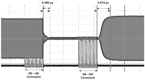 Figure 9 illustrates the mode switching waveform for the proposed LNA. In this analysis, G0 represents the highest gain mode, while G6 denotes the lowest gain mode. The waveform reveals that transitioning from the highest gain mode (G0) to the lowest gain mode (G6) involves the most significant number of factors being changed, which results in the longest switching time. This is due to the complex adjustments required when moving from a high-gain setting to a low-gain setting. The measured switching times demonstrate the LNA’s impressive performance: the transition from G0 to G6 takes approximately 0.458 µs, while the switch from G6 back to G0 is completed in about 0.874 µs. These results highlight the LNA’s capability for rapid mode switching, providing quick adaptation between different gain settings. Fast switching performance is essential for applications requiring swift changes in gain modes and optimal responsiveness to varying signal conditions. These results underscore the efficiency of the proposed LNA design in achieving rapid mode transitions, enhancing its suitability for high-speed RF applications where swift adaptation to different operational states is critical.