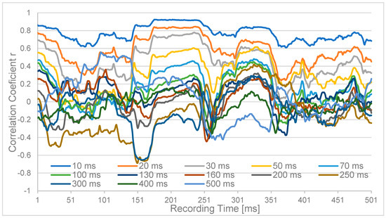 The determination of the correlation r of two data sets from channels p and q, shifted by a temporal latency Δ, is carried out according to a modified Bravais–Pearson, Equation (1),