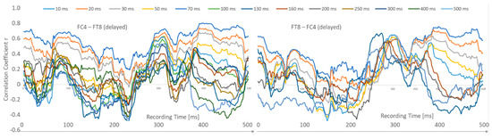 Next, the criterion of directionality was examined. Visual inspection of, for example, the neighbors afternext pairing FC4-FT8 (Figure 3) shows very similar 10 ms and 20 ms curves but different mean r-values during the first 270 msec recording period. In particular, the correlation curves for the 70 ms to 500 ms latencies are clearly different from one another. For the recording time 270–500 msec, the differences are significantly smaller, but the order of higher r-values is retained.