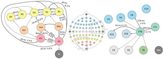 This case study addressed the hypothesis of whether EEG data allow the analysis of delays and identify directionality from surface recordings. We obtained results that EEG data can be successfully correlated, which, on the one hand, is in line with the results of Tang [36] and Bruns [54]. On the other hand, we now have numerical latency values and a practical confidence measure that can substantiate further modeling. Different latencies were calculated from recordings over the visual and auditory cortex, with shorter or longer latencies at the confidence threshold. Results are equally reflected in daily clinical experience with evoked potentials [1,46] and underline the validity of the approach taken. In particular, this is achieved from quasi-online data, since there was no stimulus-response synchronization.