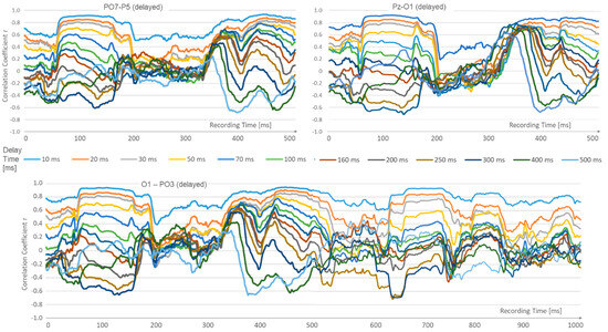 The results were time-resolved progressions of 500 msec (p-) duration (for clarity, we are using “ms” for delay times and the outdated units “sec” and “msec” to denote recording times) each (Figure 2) for the monopolar channels Oz and PO3 for the different latencies. While the short latencies up to 30 ms are consistently positively correlated, the longer latencies up to 300 ms fluctuate around zero, and the very long latencies tend to be anticorrelated.