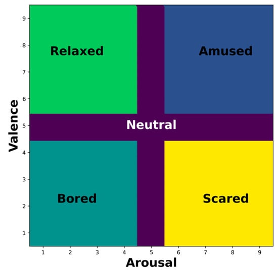To align the study with a structured emotional framework and facilitate comparative analyses, discrete emotional state labels were derived from specific intervals of the continuously reported arousal and valence scores. This relabeling process yielded five distinct emotional categories, neutral, amused, bored, relaxed, and scared, as shown in Figure 1. Specifically, the ‘neutral’ emotional state was defined as a range of arousal and valence scores from 4.5 to 5.5 on the 9-point scale, creating a clear demarcation for this often-ambiguous central region of the circumplex model. The five discrete emotional categories were derived from specific intervals of continuously reported arousal and valence scores. This approach aligns with the works of [,], which emphasized the importance of including the neutral state in emotional process analyses. The ‘neutral’ state was specifically defined within the range of 4.5 to 5.5 on the 9-point scale for both arousal and valence dimensions, providing a clear demarcation of this central region in the circumplex model. This systematic categorization ensures comprehensive coverage of the emotional spectrum while maintaining scientific rigor in our analysis.