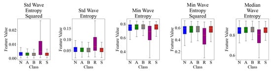 We identified five key features derived from the wavelet entropy analysis that showed significant differences across the five emotional states: neutral (N), amused (A), bored (B), relaxed (R), and scared (S). These features are the standard deviation of wave entropy (std wave entropy), minimum of wave entropy (min wave entropy), median of wave entropy (median wave entropy), and their squared versions. Table 2 presents these features along with their F-statistic and p-values from one-way ANOVA tests.