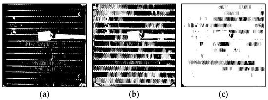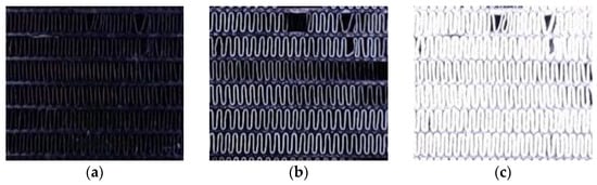 Stages of frost formation on the HX captured by the computer vision method: no frost detected (a), partial frost accumulation (b), and almost complete frost coverage (c).