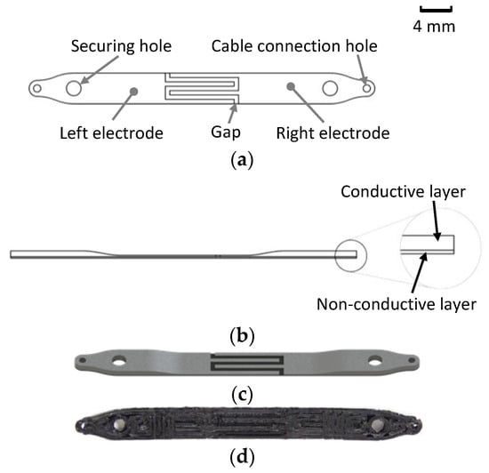 The use of Fused Filament Fabrication (FFF) technology for sensor fabrication introduces limitations based on the nozzle diameter, which in this case was 0.6 mm, though this parameter can be adjusted by changing the nozzle. The sensor was designed to be optimized for manufacturing characteristics (design for additive manufacturing—DFAM), including a layer height of 0.2 mm and a nozzle diameter of 0.6 mm. As a result, the insulating base layer is 0.2 mm thick, while the conductive circuit layer also has a thickness of 0.2 mm and 0.6 mm width. The gap between the electrodes can be customized independently of the nozzle diameter. For this study, a gap of 0.5 mm was selected. At the sensor’s extremities, the conductive layer is thicker, reaching 0.8 mm. This increased thickness enhances mechanical durability in the fixture regions and improves electrical contact between the sensor electrodes and the connecting cables. This profile is illustrated in Figure 6b.