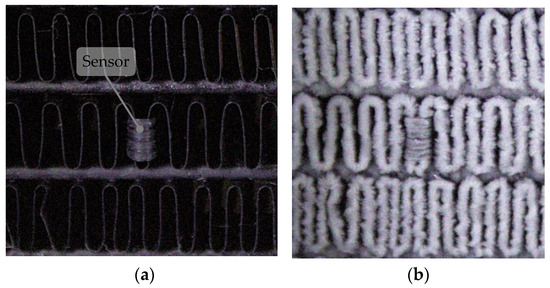 The resistivity of the electrode medium changes according to the presence of different materials—air, water, or frost. When condensation or frost forms between the electrodes, the electrical resistivity changes significantly due to the distinct resistivity values of these materials. By measuring overall sensor resistance, it is possible to infer the presence of condensation or frost accumulation on the heat exchanger (HX) surface. In previous studies, a copper wire electrode sensor with a fabric medium between the electrodes demonstrated the best frost-detection performance among all resistive sensor mediums tested. This sensor is depicted in Figure 4.