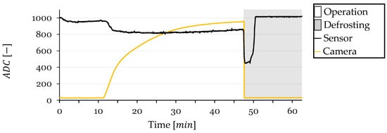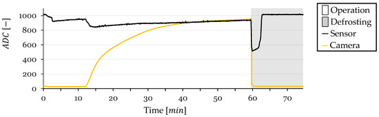 To validate the sensor’s performance, measurements were compared with data obtained from a previously developed computer vision (CV) method [24]. This method involves capturing images of the HX surface, cropping them to the HX intake surface, and processing them to detect frost accumulation. This method processes images with a resolution of 351 × 351 pixels, where each pixel is classified as either “frost” or “no frost” based on a predefined threshold that accounts for the HX color and lighting conditions. The total number of pixels identified as frost is then normalized to a scale from 0 to 1023, ensuring compatibility with the ADC’s resolution and facilitating direct comparison with the sensor’s measurements, as shown in Figure 9.