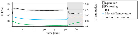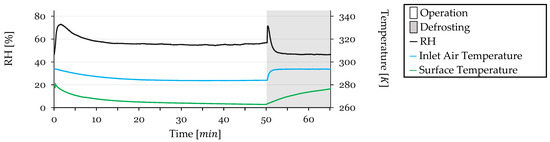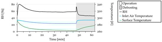 The RH exhibits a sharp spike at the beginning of the test due to the initial recirculation of humidified air. It reaches a maximum of 80%, then begins to decrease as the HX surface temperature drops to the dew point, initiating condensation on the HX surface and dehumidifying the air. After 20 min, a balance is achieved between the humidifier’s capacity to humidify the air and the HX’s capacity to remove moisture, stabilizing at approximately 58%. During defrosting, when the system is open to the external air, warmer intake air enters the circuit, leading to an increase in RH to 78%, which quickly drops back, reaching 62% as the HX dries and the system stabilizes, by the end of the cycle.