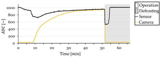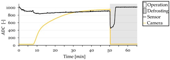 During Cycle 3, the sensor’s ADC value decreased from 1010 to approximately 920 due to condensation, stabilizing with a slight increase over time (Figure 15). A sharp drop in ADC value occurred at min, indicating frost formation, which aligned with the CV method’s frost-detection initiation. The sensor readings saturated at min while the CV method recorded a frost-detection value of 204.