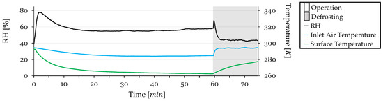 RH peaks at 73% at the start and stabilizes at 56% by 15 min as condensation begins to dehumidify the air. During defrosting, RH peaks again at 70%, then decreases to 47% as the HX dries.