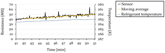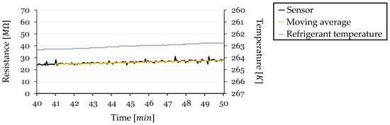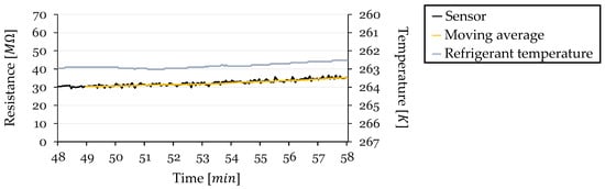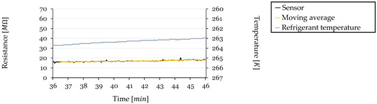 For each frost-defrost cycle, the last 10 min before defrosting were analyzed. This timeframe was chosen because the sensor’s resistance is primarily influenced by temperature variations during this steady-state period. Resistance (in MΩ) is plotted on the left y-axis, and temperature (in Kelvin) is plotted on the right y-axis, with the temperature axis presented in reverse order. This orientation aligns the direction of temperature decrease with the observed increase in resistance, facilitating a direct comparison of the slopes.
