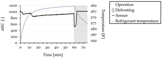 An analysis of the values and temperature data reveals that a correlation between temperature and readings is observable only during the steady-state region before defrosting. During phases of condensation, frost formation, and defrosting, no apparent relationship exists between these two variables. This indicates that while temperature variations are expected to always influence sensor readings, their influence is minimal compared to other factors that have a more significant effect. Consequently, they are not the predominant factor affecting fluctuations during periods of rapid environmental changes. In these non-steady-state phases, factors such as the physical presence of condensation, frost accumulation, and the melting process during defrosting have a more significant impact on the sensor’s readings than temperature alone.