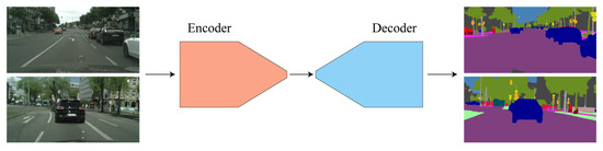 The advancement of computer hardware and the improvement in GPU computing power have provided effective support for further research in semantic segmentation methods. Figure 1 depicts a semantic segmentation model based on fully convolutional neural networks, which has become the mainstream method in the field of semantic segmentation due to its superior feature extraction performance. Compared to traditional image segmentation methods, FCNs enable end-to-end, pixel-to-pixel segmentation algorithms, allowing for the extraction of higher-level semantic information from images and significantly improving segmentation accuracy. Researchers have proposed a series of classic segmentation networks based on fully convolutional neural networks. Long et al. [24] adapted contemporary classification networks into fully convolutional networks and transferred their learned representations by fine-tuning to the segmentation task. Badrinarayanan et al. [25] presented a novel and practical deep fully convolutional neural network architecture for semantic pixel-wise segmentation termed SegNet. The decoder of the network upsamples input feature maps at lower resolutions, eliminating the need for learning to improve sampling rates. Ronneberger et al. [26] proposed the U-Net network, which can be trained end-to-end from a very small number of images and has a fast network speed. For scene parsing tasks, Zhao et al. [27] proposed a pyramid scene parsing network that utilizes global context information through different region-based context aggregation, achieving good performance. Chen et al. proposed an approach to spatial pyramid pooling (ASPP) to robust segment objects at multiple scales, which addresses the task of using deep learning for semantic image segmentation [28,29,30,31]. These networks have had a significant impact on subsequent research in semantic segmentation.