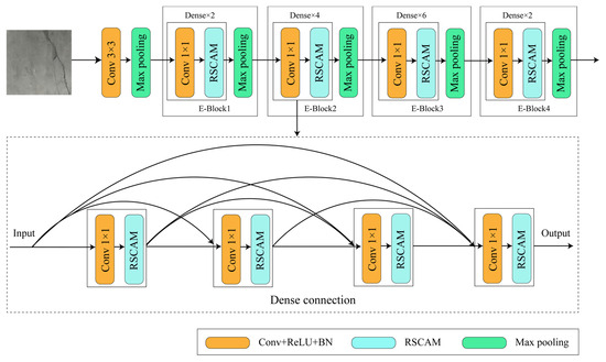As shown in Figure 3, the encoder consists of four E-blocks. The input image data undergo 3 × 3 convolution and max pooling operations for standardization and preprocessing. The other four E-blocks are composed of 1 × 1 convolutions, residual separable convolution attention models, and max pooling. They are also internally connected in a dense manner. The residual separable convolution attention models fuse feature information from multi-scale channels, enabling comprehensive capture of pixel-level semantic information in the image. Subsequently, a series of max pooling operations are applied to obtain low-dimensional feature information related to object edges, colors, and other characteristics.